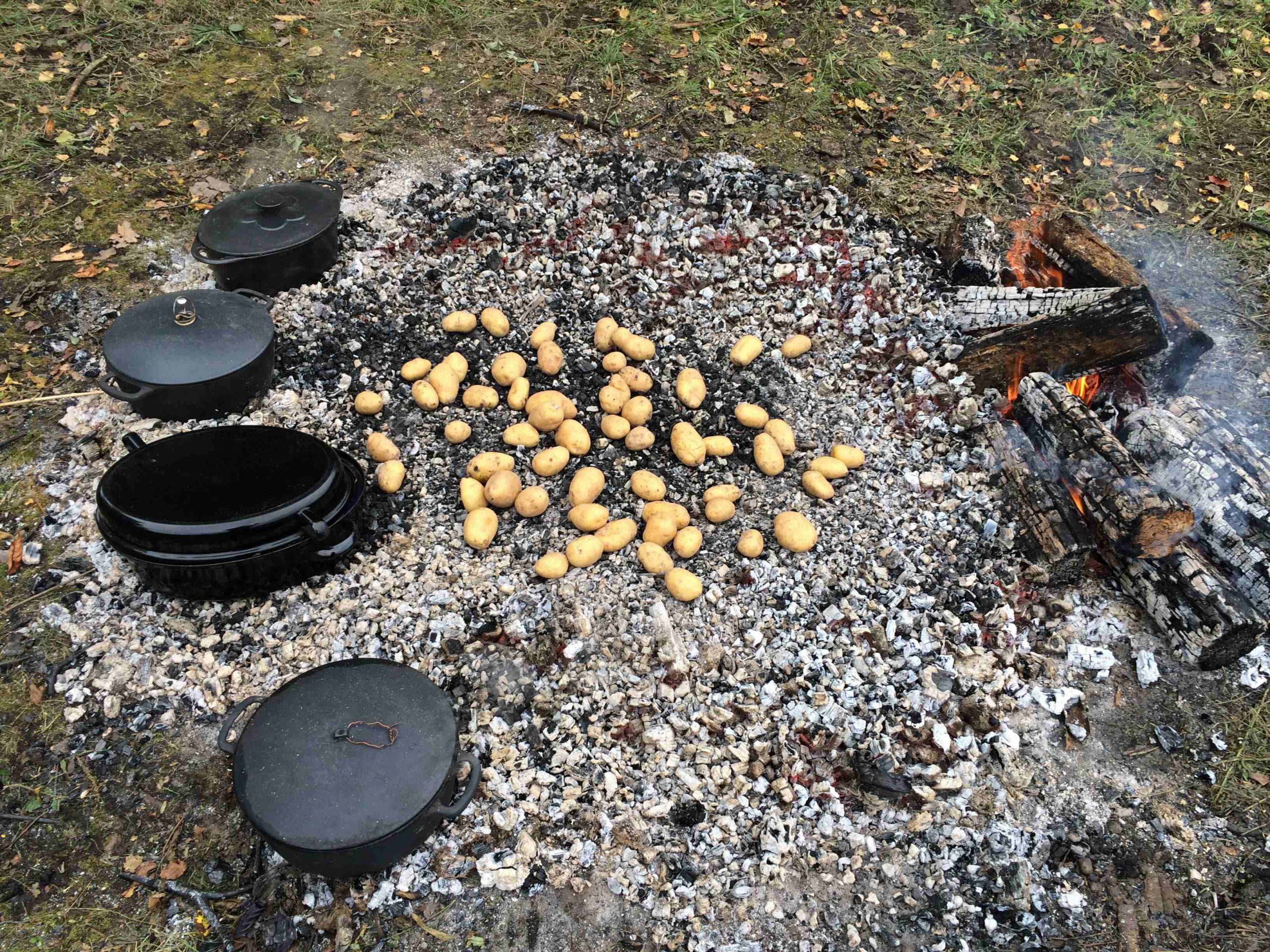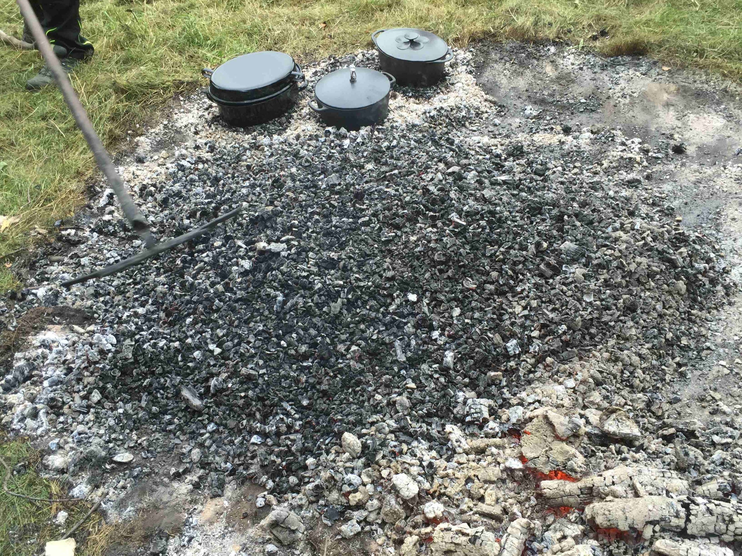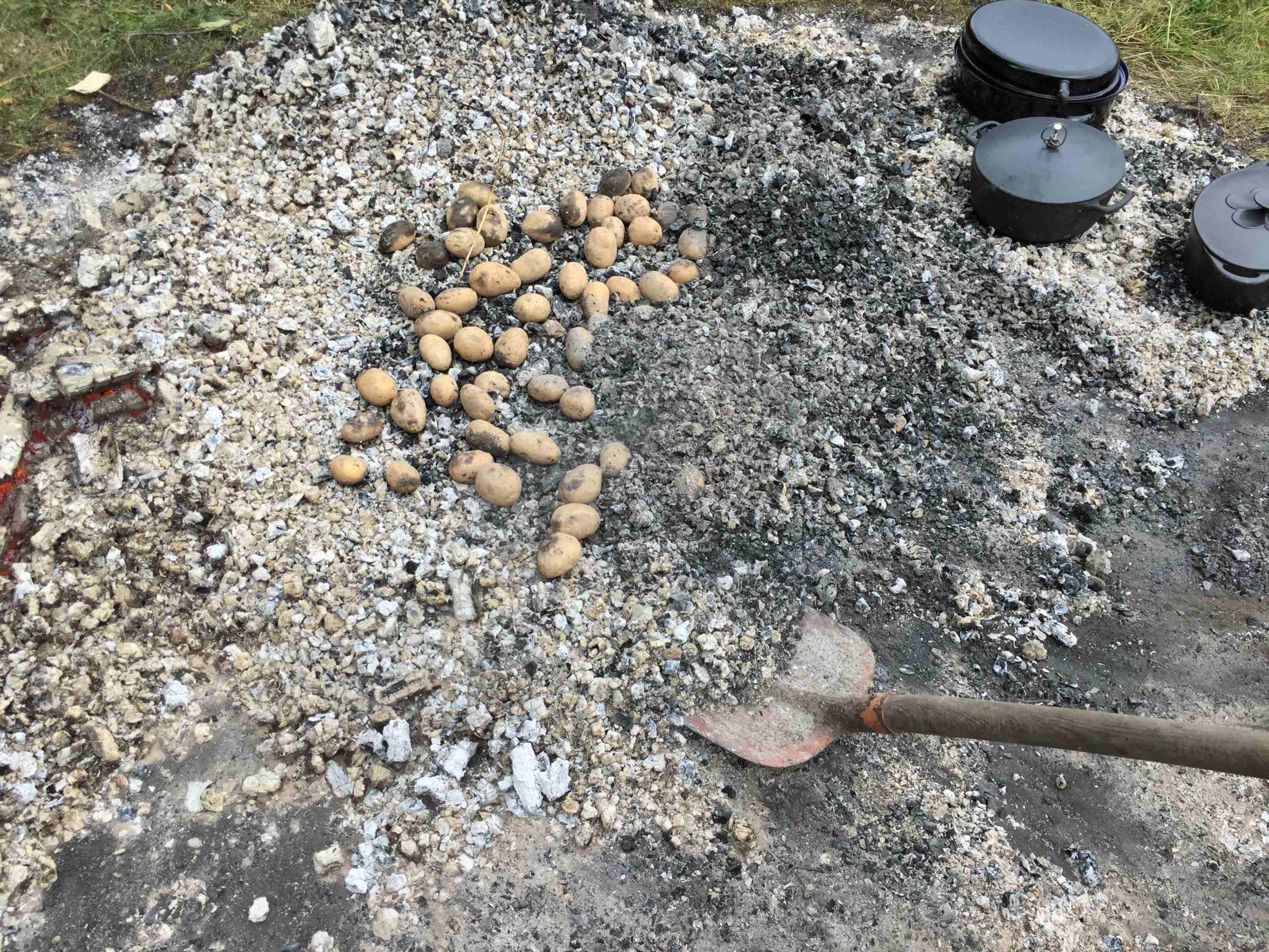 Wenn alles richtig gemacht wurde, sind das Fleisch und die Kartoffeln gleichzeitig fertig. Die Töpfe werden von der Feuerstelle geholt und die Kartoffeln wieder aus dem Glutberg ausgegraben.