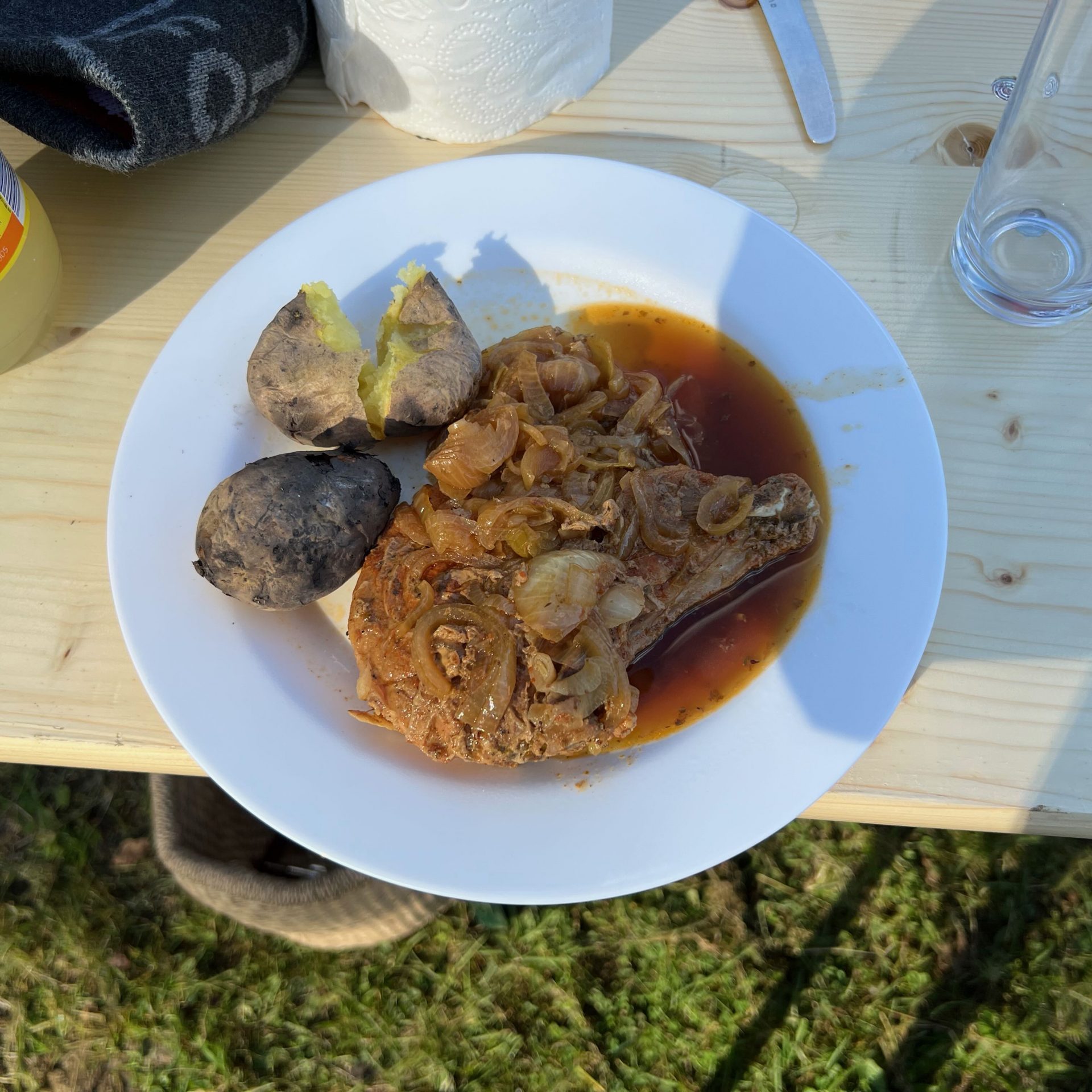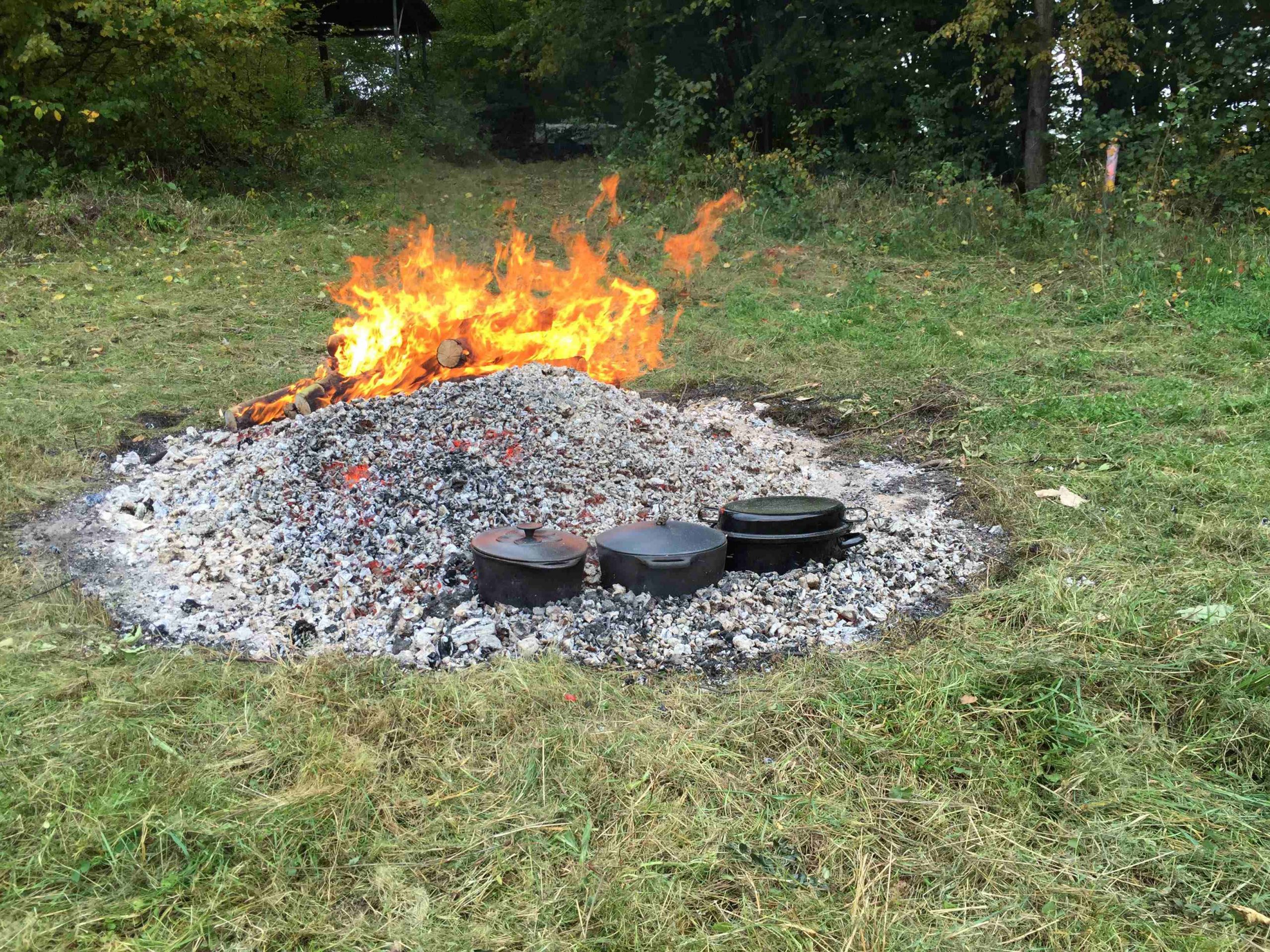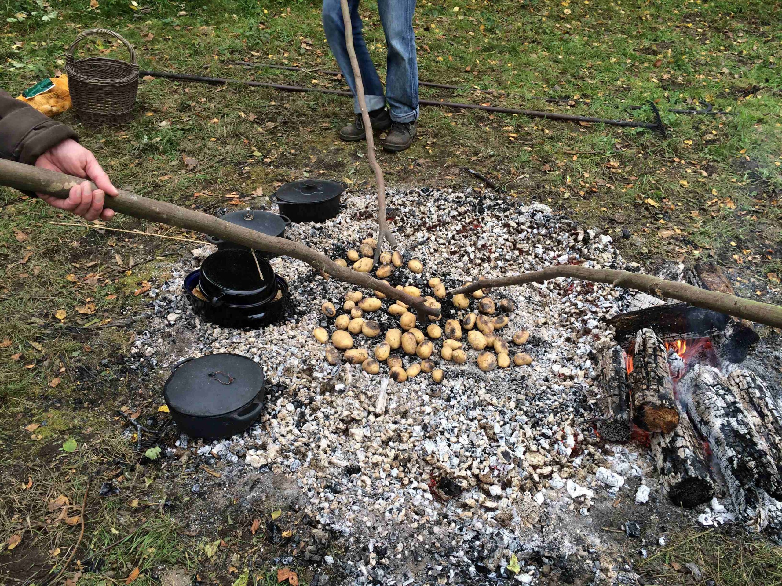 Wenn alles richtig gemacht wurde, sind das Fleisch und die Kartoffeln gleichzeitig fertig. Die Töpfe werden von der Feuerstelle geholt und die Kartoffeln wieder aus dem Glutberg ausgegraben.