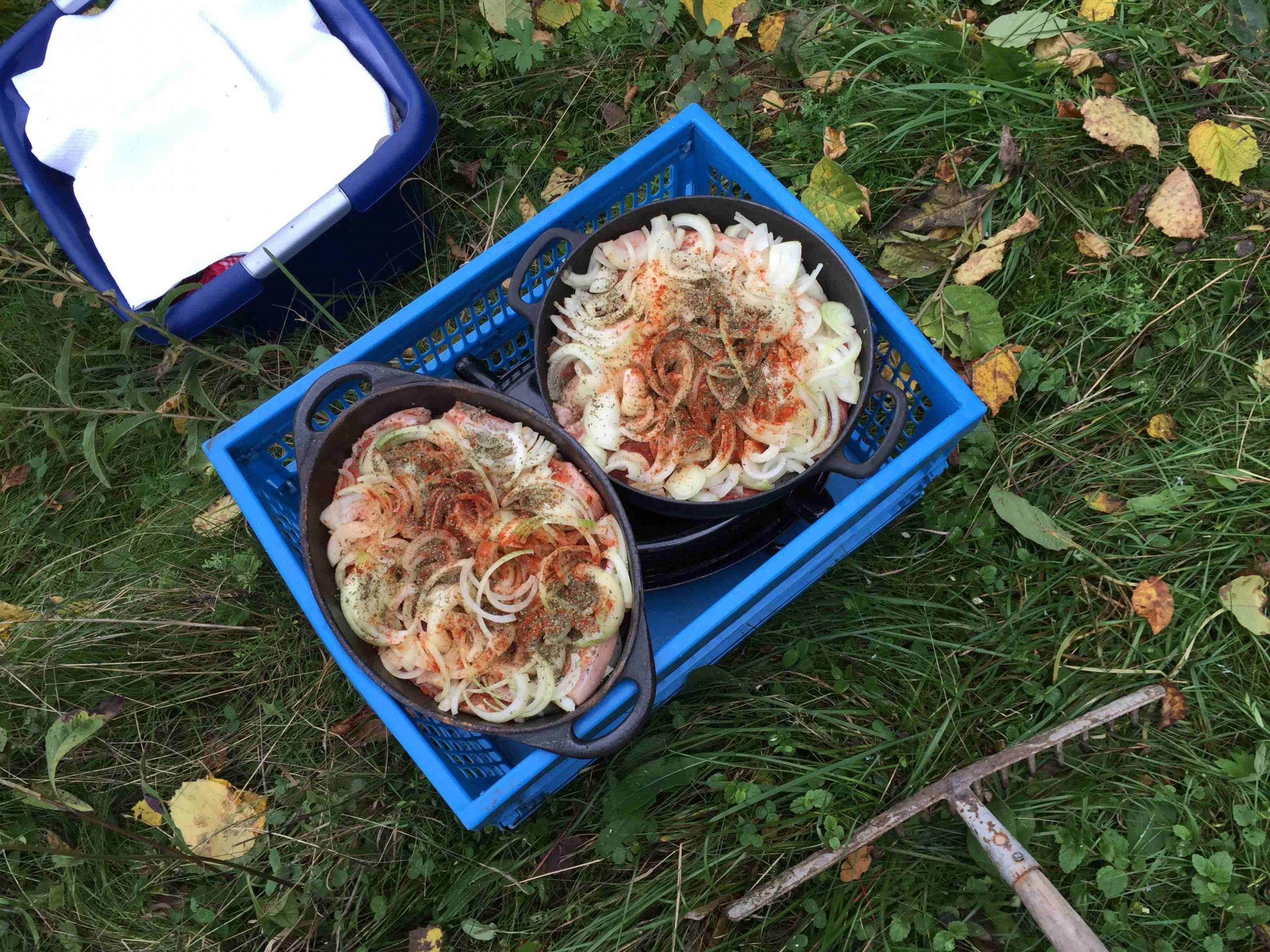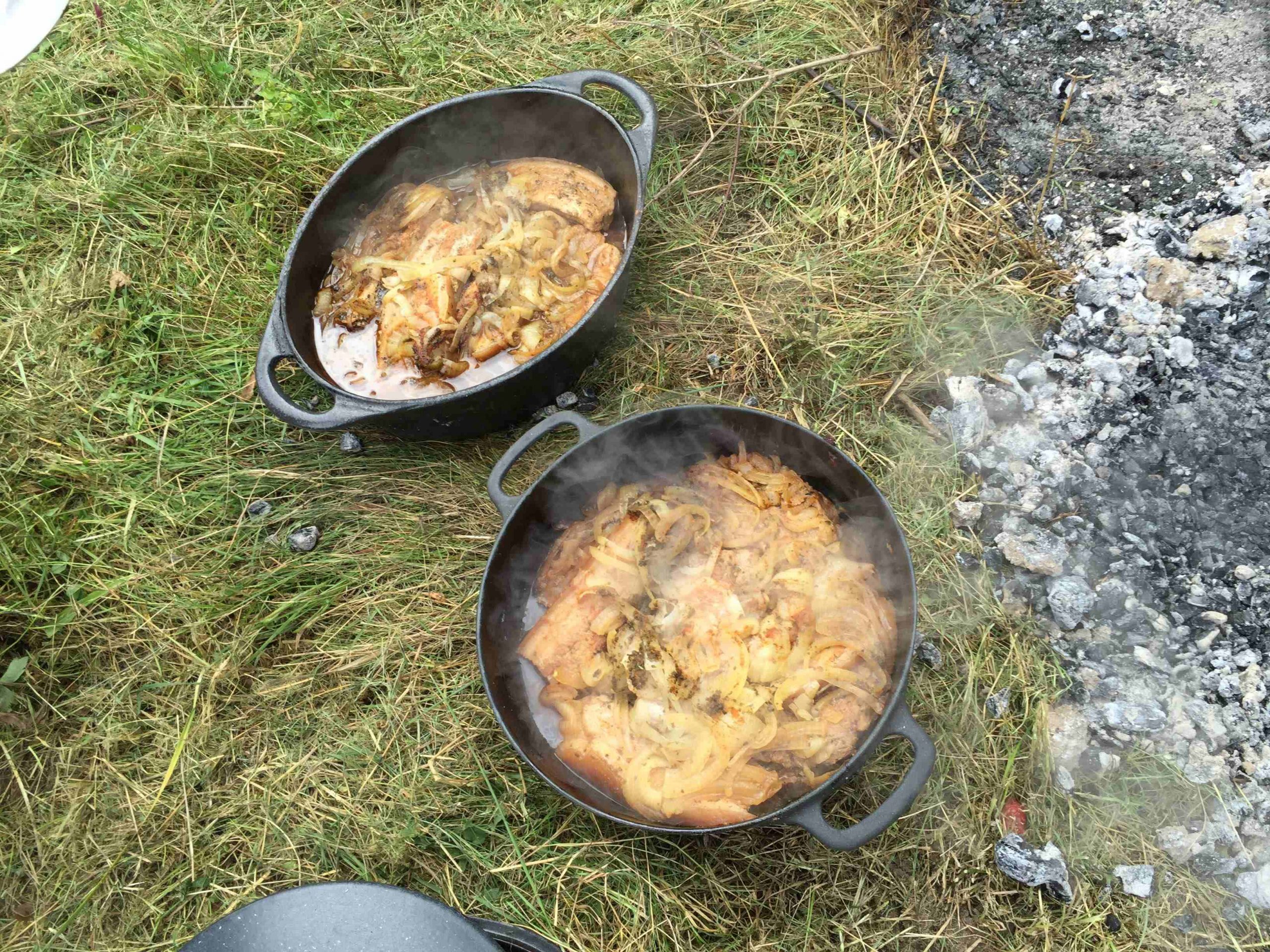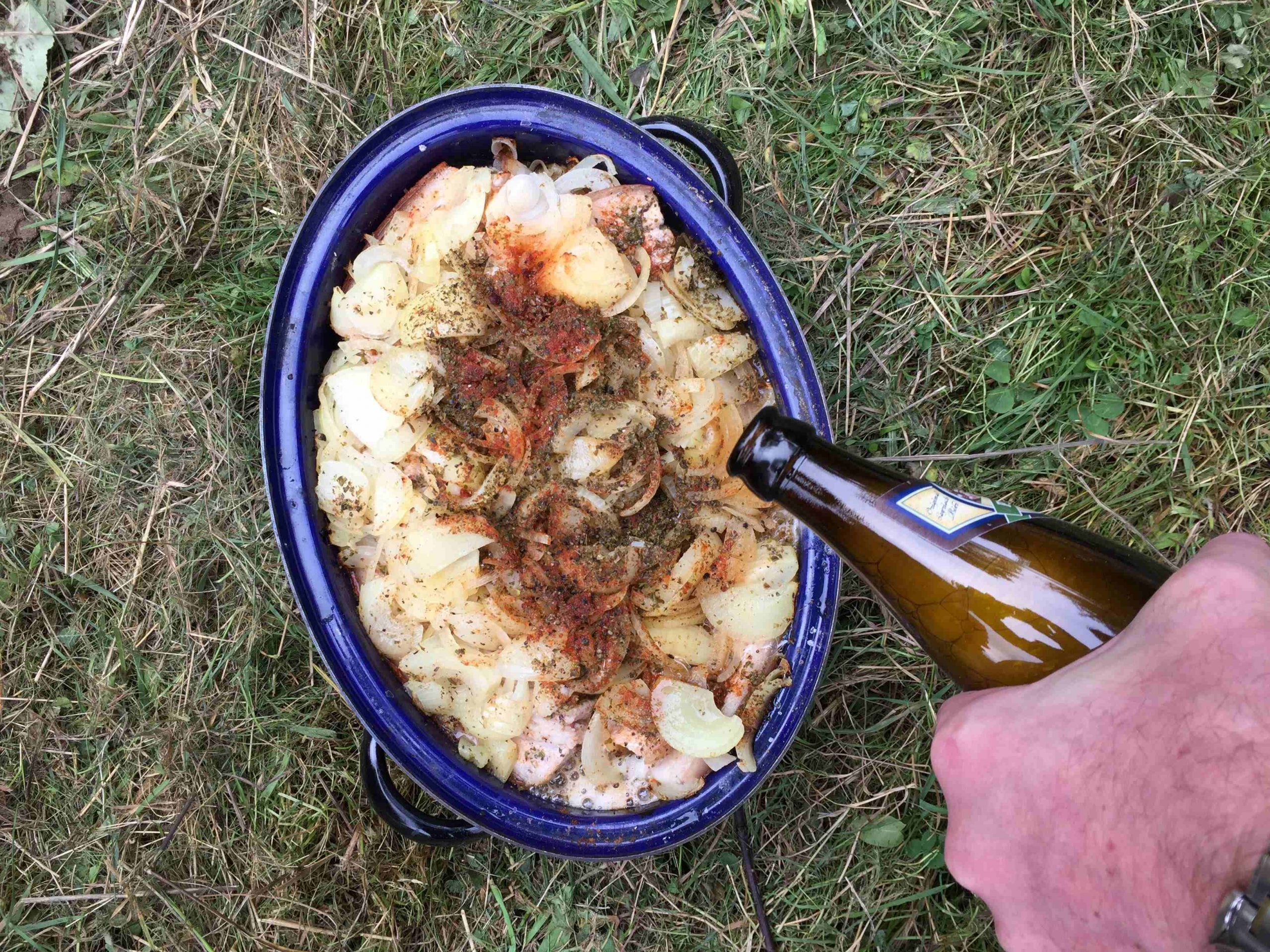 Es dauert nun ca. 1 ½ Stunden, bis das Fleisch fertig ist. In regelmäßigen Abständen, d.h. etwa alle 20 bis 30 Minuten, werden die Töpfe von der Glut genommen, um den Zustand des Gargutes zu überprüfen. Sollte Flüssigkeit fehlen, wird mit Bier aufgegossen.