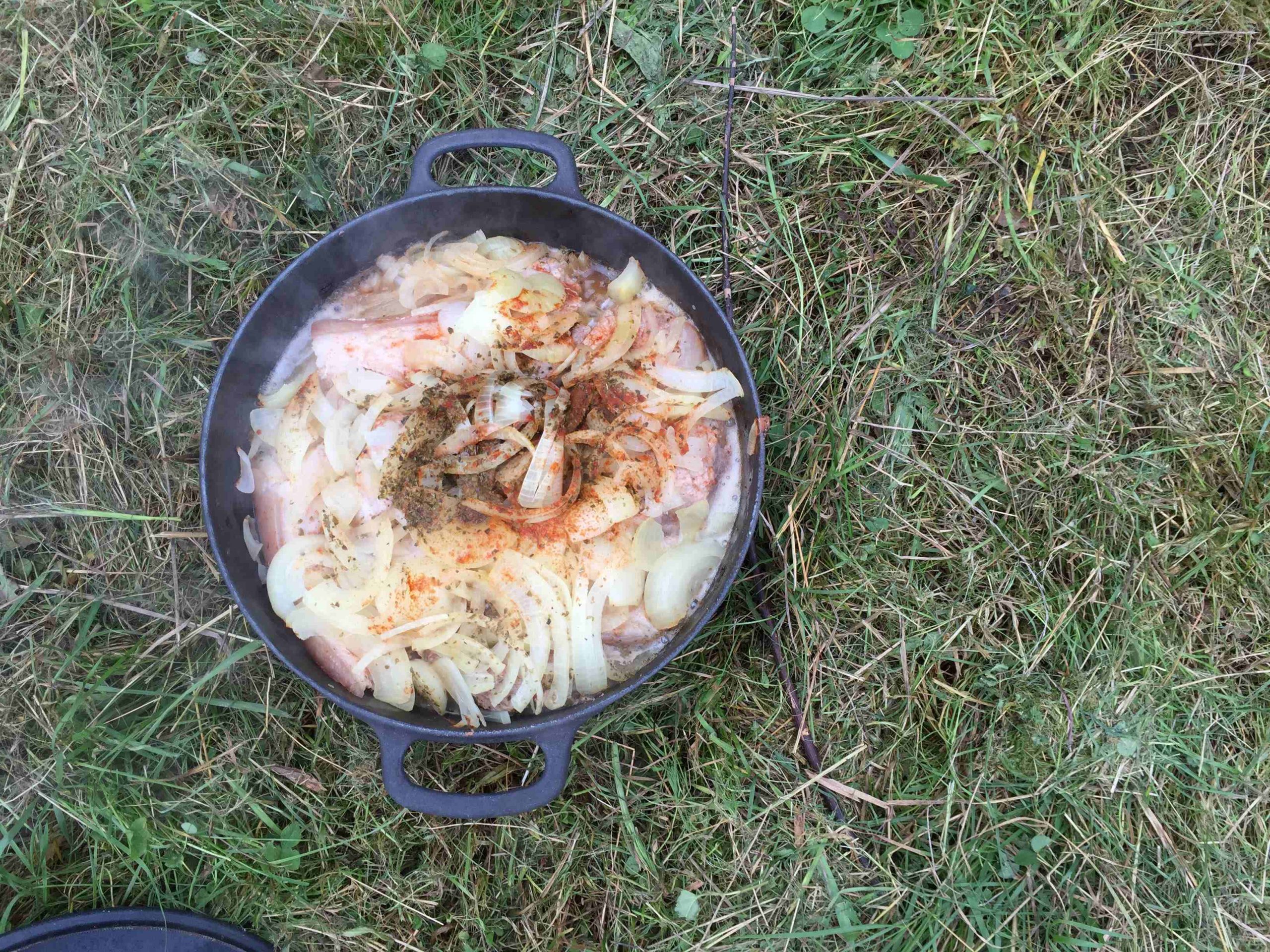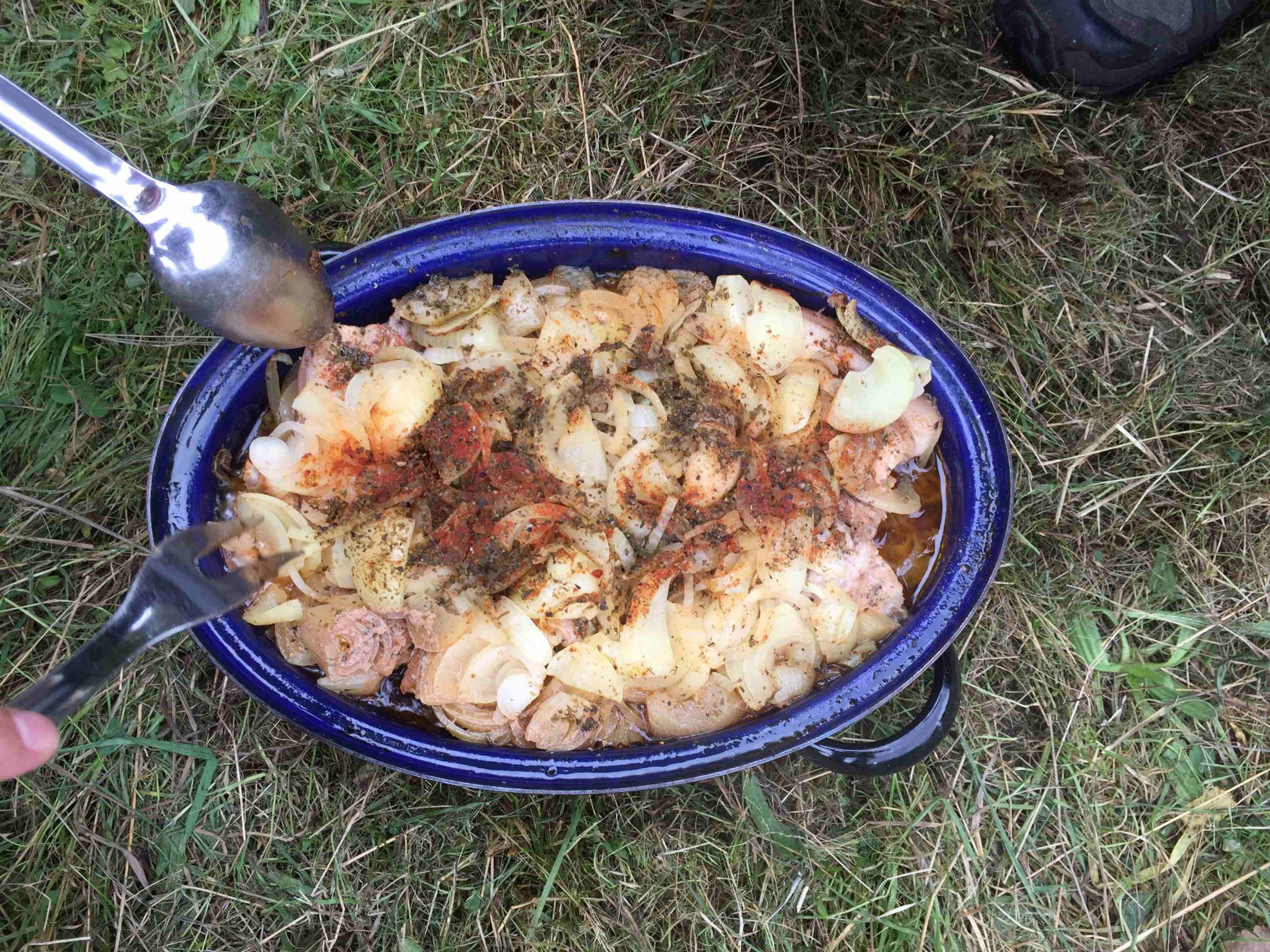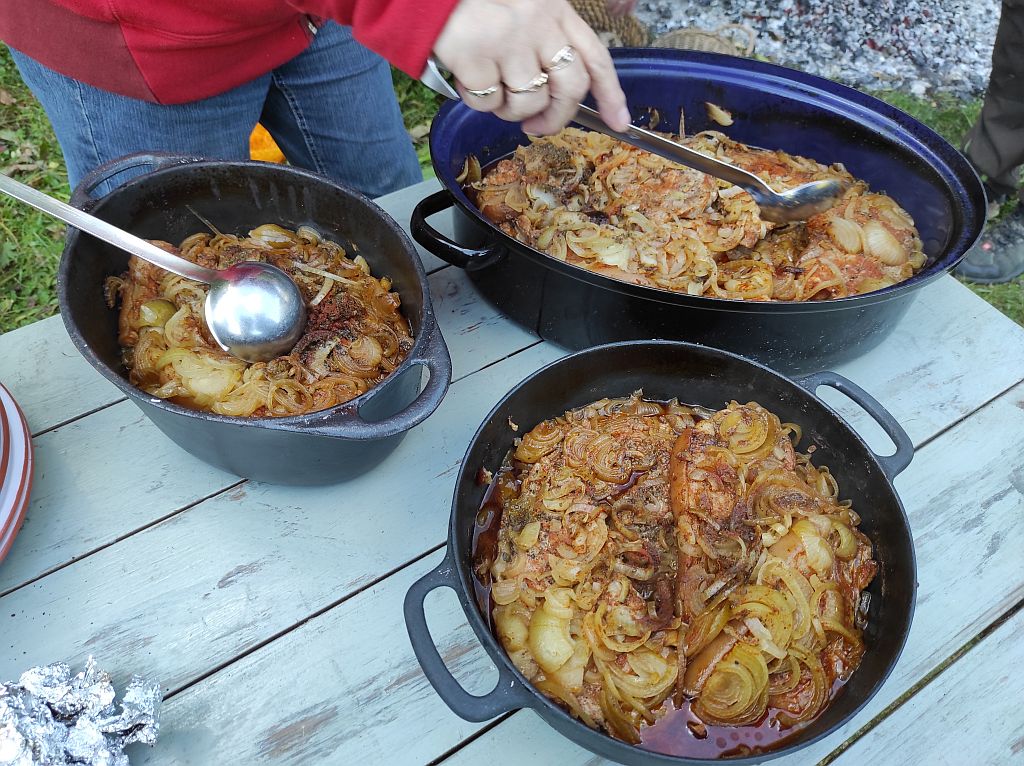 Es dauert nun ca. 1 ½ Stunden, bis das Fleisch fertig ist. In regelmäßigen Abständen, d.h. etwa alle 20 bis 30 Minuten, werden die Töpfe von der Glut genommen, um den Zustand des Gargutes zu überprüfen. Sollte Flüssigkeit fehlen, wird mit Bier aufgegossen.