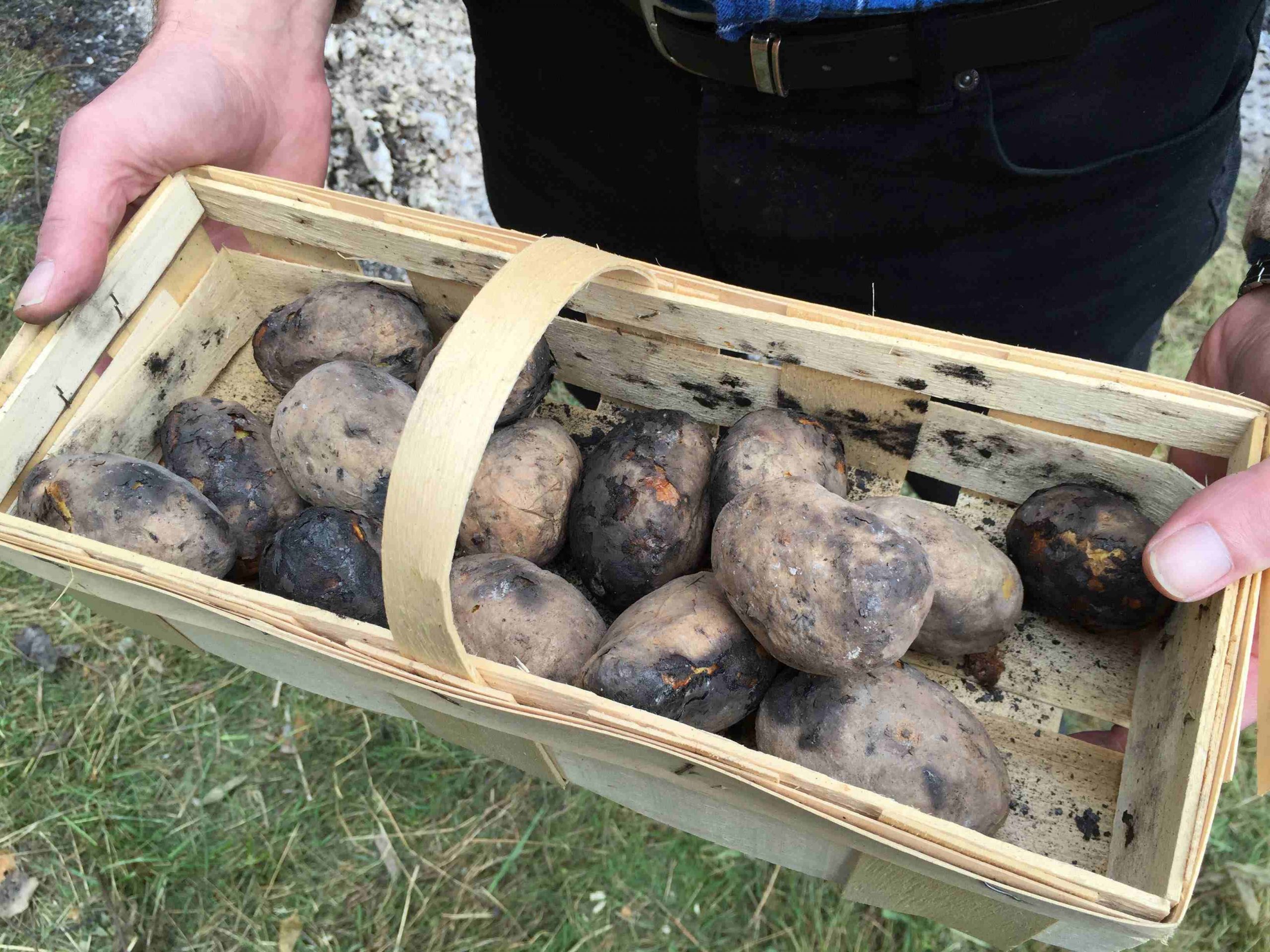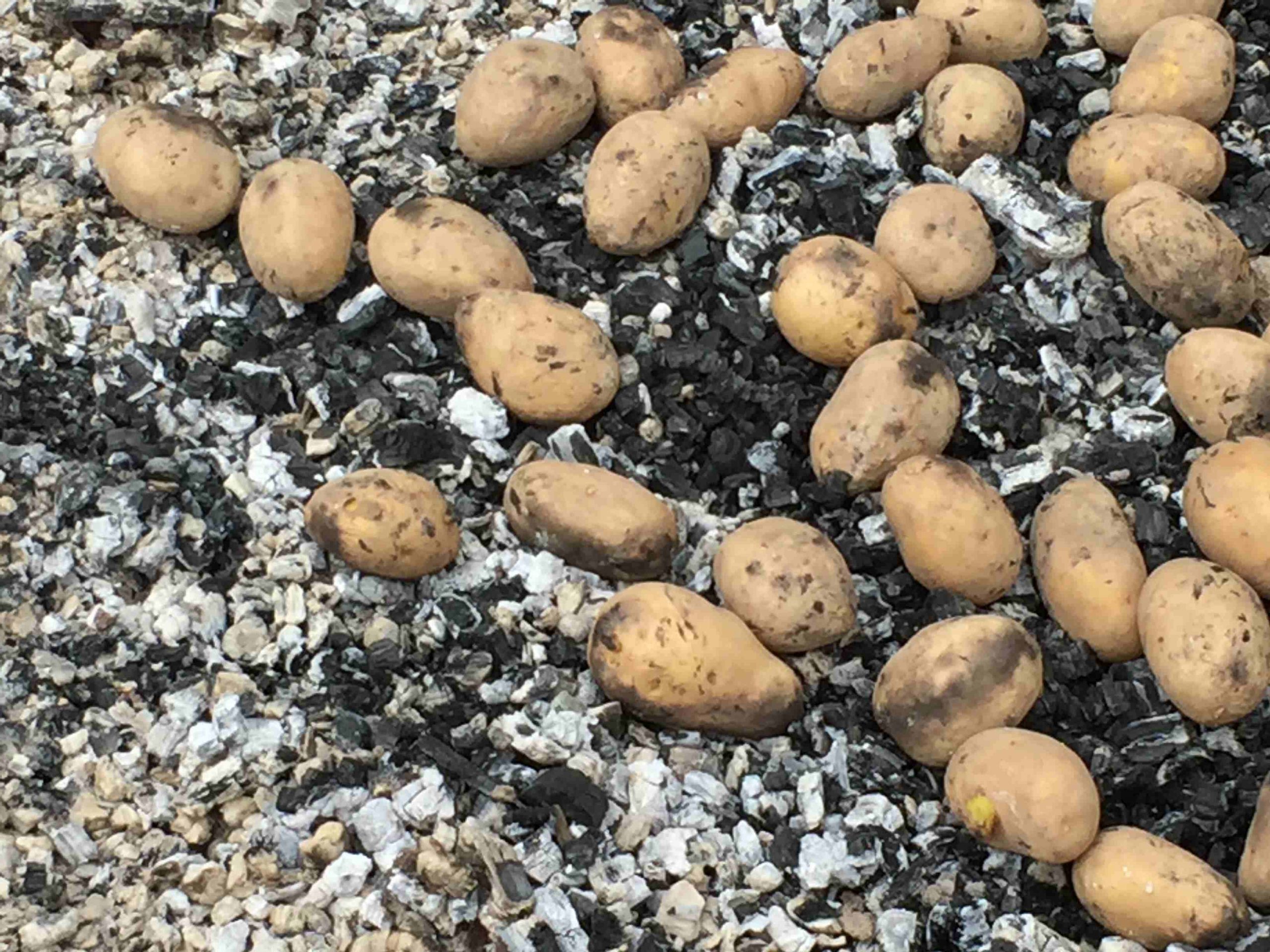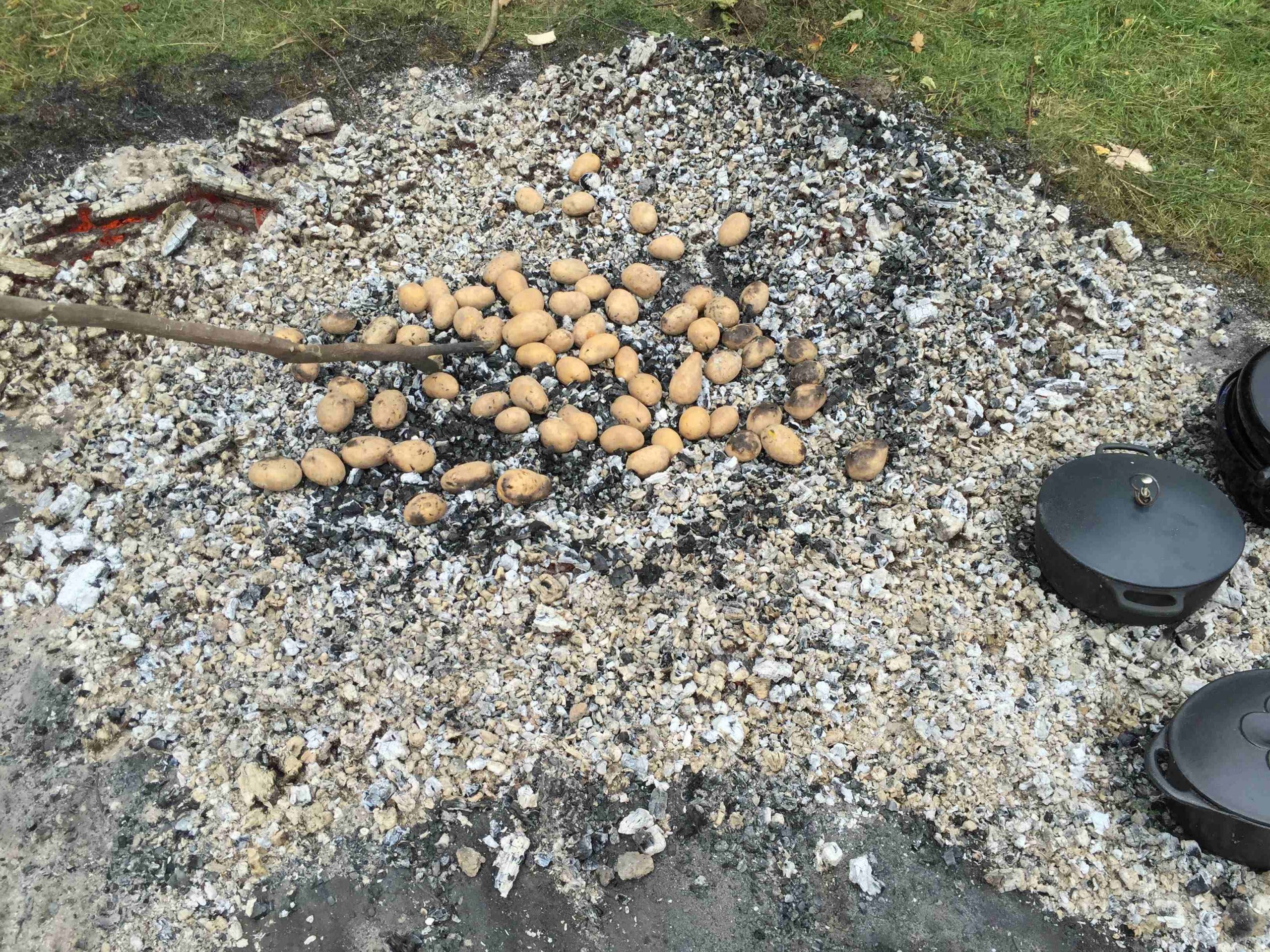 Haben die Kartoffeln eine zufriedenstellende Kruste erreicht, werden sie auf der Feuerstelle mit den erwähnten Holzstangen in der Mitte zu einem kleinen Hügel aufgeschichtet. Anschließend wird mit einer Schaufel die umliegende Glut auf sie geschaufelt, bis sie völlig darunter vergraben sind. Je nach Größe und Dicke der Kartoffeln dauert es jetzt ca. 20 Minuten, bis sie gar sind und herausgeholt werden können.