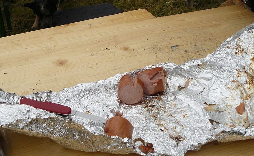 Drei Stunden Wartezeit sind lange. Für den Hunger zwischendurch werden gerne ein oder zwei in Alufolie eingelegte Fleischwurst-Ringe in der Glut vergraben und anschließend pur oder mit Brotscheiben zum Frühstück verzehrt.